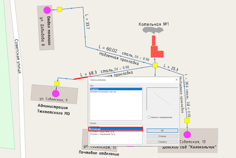 - выделятся элементы (потребители, участки трубопроводов, тепловые камеры и т.д.), попавшие в зону аварийного отключения. Отключаемые трубопроводы выделяются красным цветом. Отключаемые потребители выделяются красным крестиком. Тепловые сети после отказавшего элемента выделяются красным цветом;